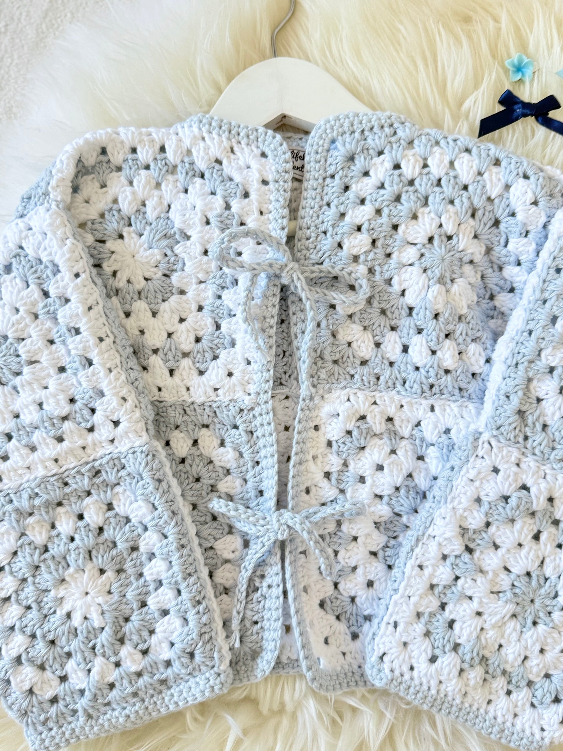 Das Modell „Blue Cotton Dream“ besteht aus zarten Granny Squares in sanften Blau- und Weißtönen, die zu einem einzigartigen Muster zusammengesetzt sind. Durch die lockere Passform und die praktischen Bindebänder vorne lässt sich die Jacke einfach an- und ausziehen – ideal für den Alltag und besondere Anlässe. Endlich ein Cardigan, den auch Jungs tragen können – und es werden noch viele weitere folgen!