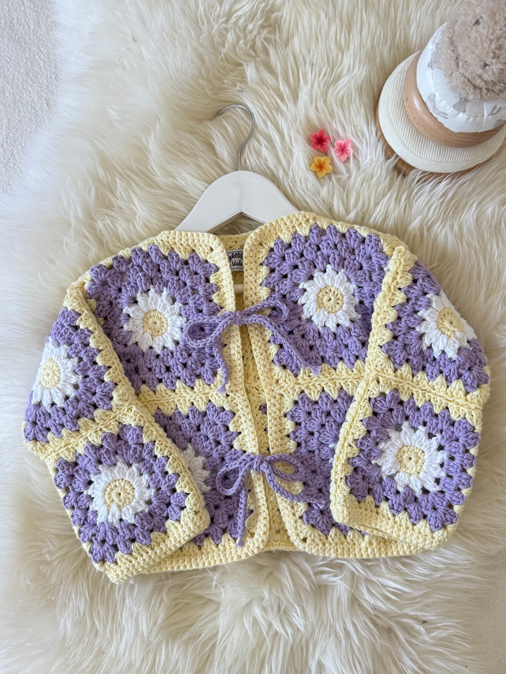 "Daisy“ ist eines meiner Lieblingsstücke - ein fröhlicher Blickfang in Lila und Pastellgelb, verziert mit liebevollen Blumen-Applikationen. Hergestellt aus weicher, hochwertiger Baumwolle, hält sie angenehm warm, ist atmungsaktiv und besonders sanft zur empfindlichen Kinderhaut. Der Cardigan lässt sich vorne mit zwei niedlichen Schleifen schließen, die ein verspieltes Detail setzen. Der bequeme Schnitt bietet viel Bewegungsfreiheit beim Spielen, Toben und Entdecken - und die süßen Blumen machen die Jacke zu einem echten Lieblingsstück für kleine Abenteurer:innen.