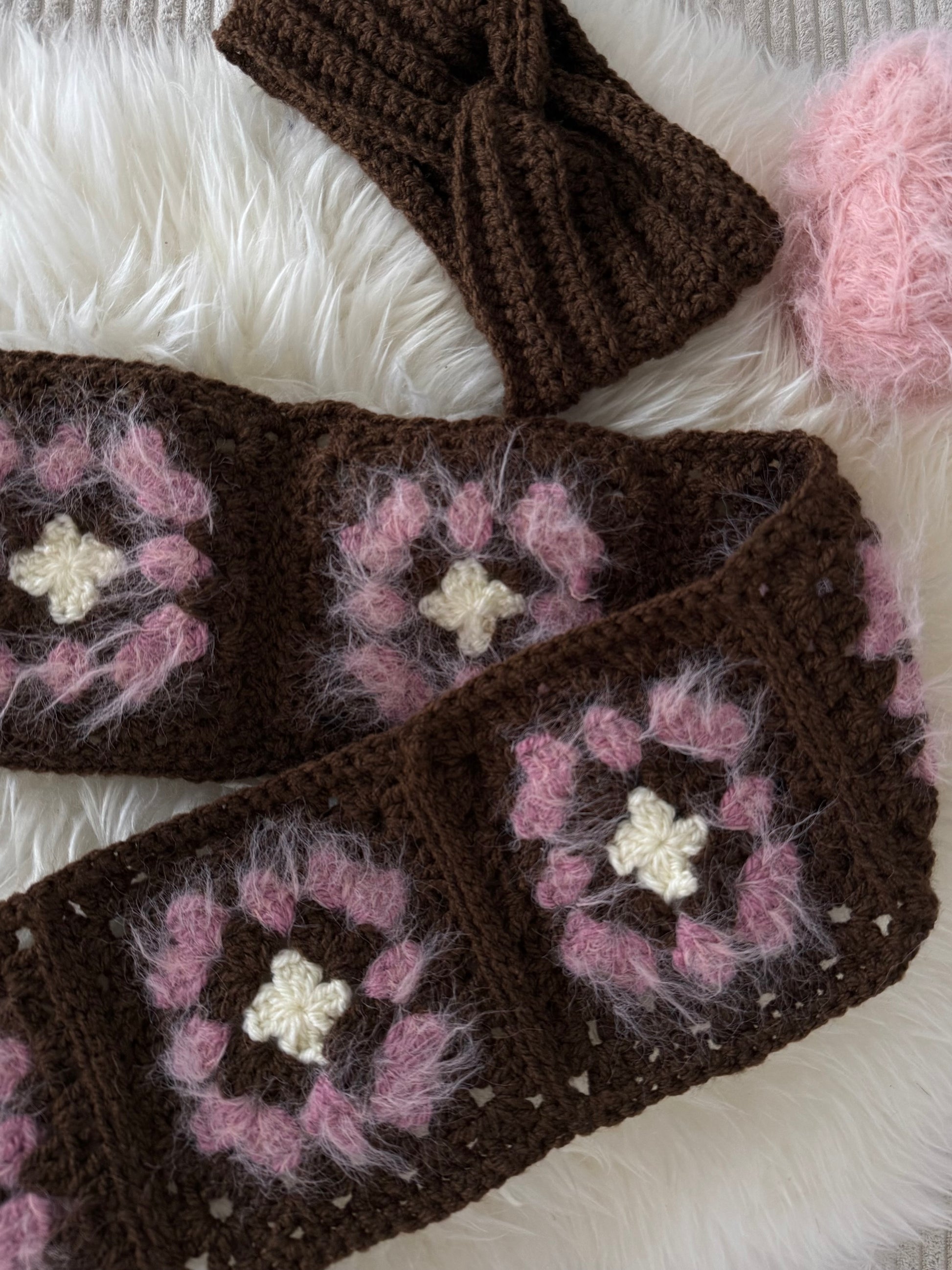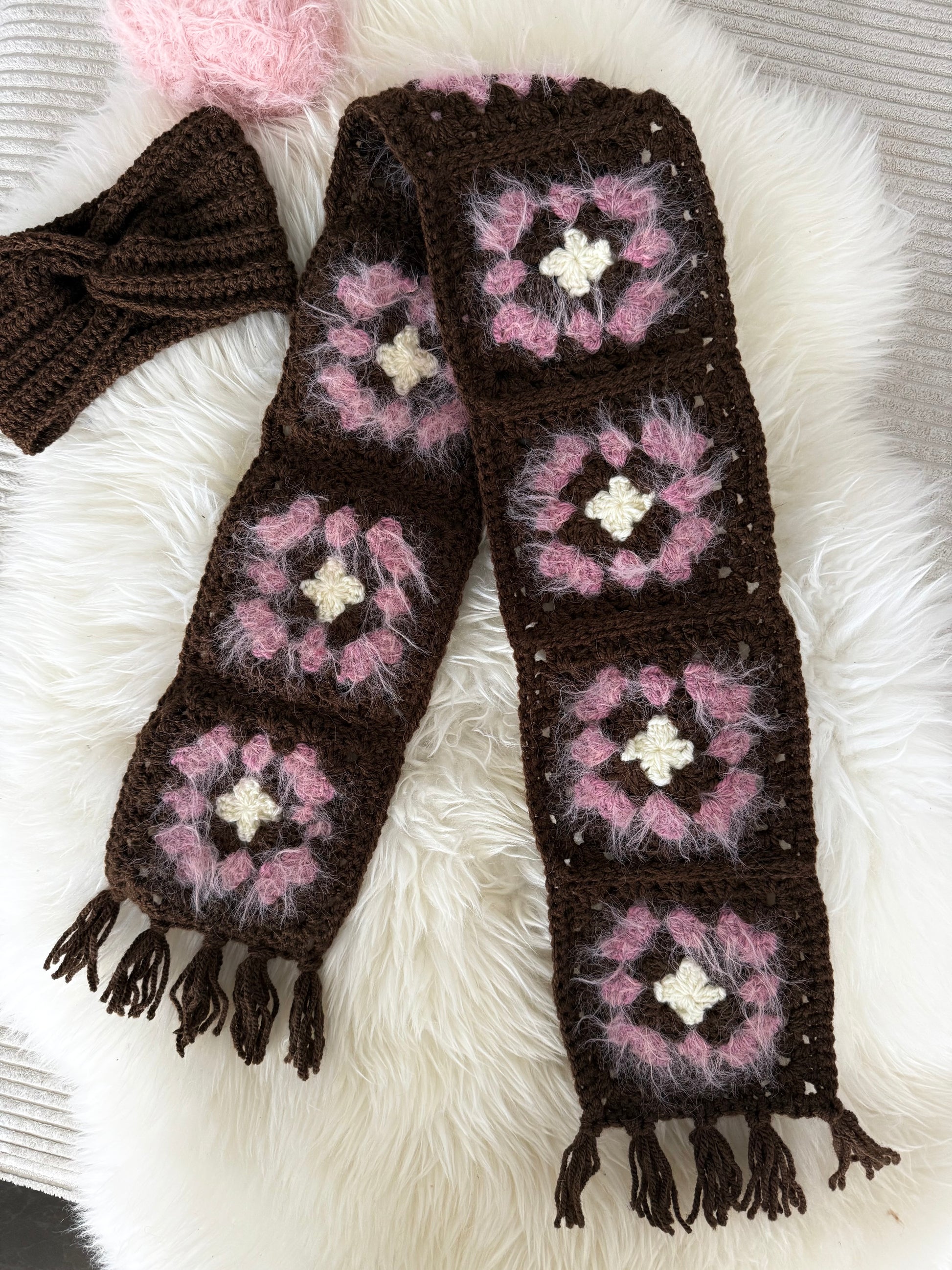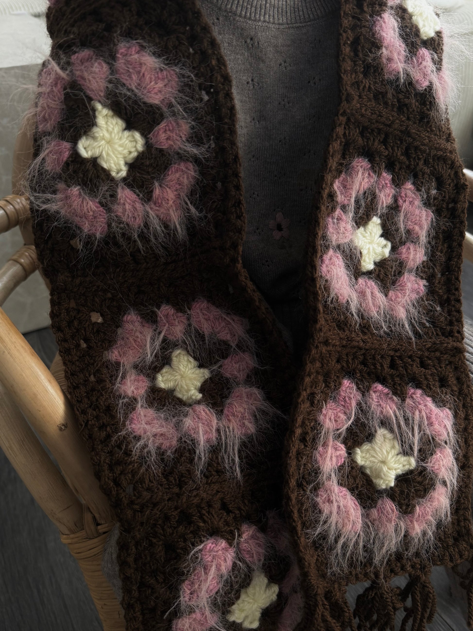 Die handgemachten Granny Squares kombinieren Schokobraun, Light Lilac, Rosé Lash Hair und Ecru zu einem fröhlichen Farbspiel. Fransen an den Enden sorgen für einen verspielten Look.